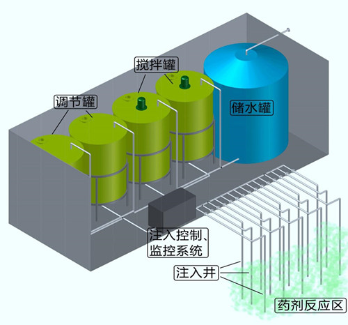 原位注入技术借用一定的设备将化学药剂注入到地下,通过化学药剂与污染物之间的物理化学作用,降低污染物质的迁移性,使污染物毒性降低或变成无毒性的一种方法。抽提设备通过抽水井,进行地下水位控制,协助药剂的传输。